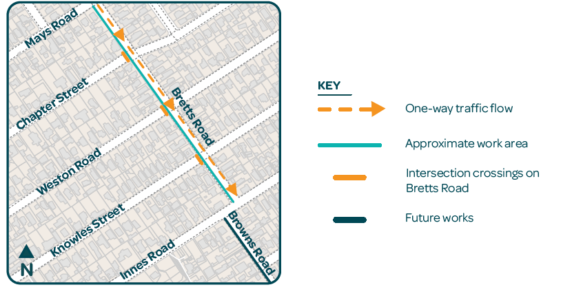 From 20 October, Bretts Road will be one-way travelling from Mays Road to Innes Road while we work across the intersections of Chapter Street, Weston Road and Knowles Street.