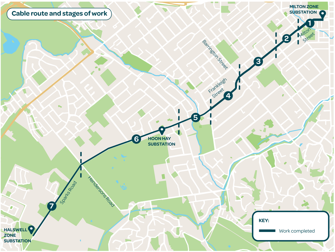 We've now completed work to install the new power cable between the Milton Street Substation and the Halswell Substation on Sparks Road. We thank the communities we've been working in for their patience and understanding while we completed these essential upgrades.