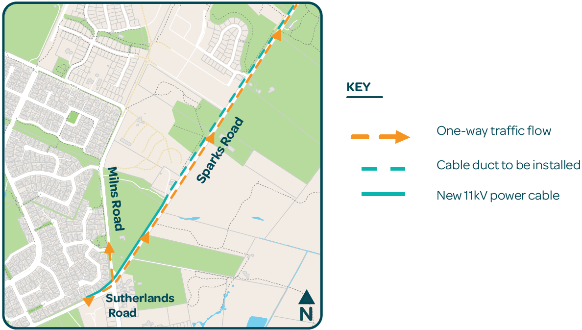 Until mid November, we will work to install 66kV cable ducts and a new 11kV power cable on Sparks Road between Sutherlands Road and Hendersons Road. To do this work safely, a one-way system will be in place.