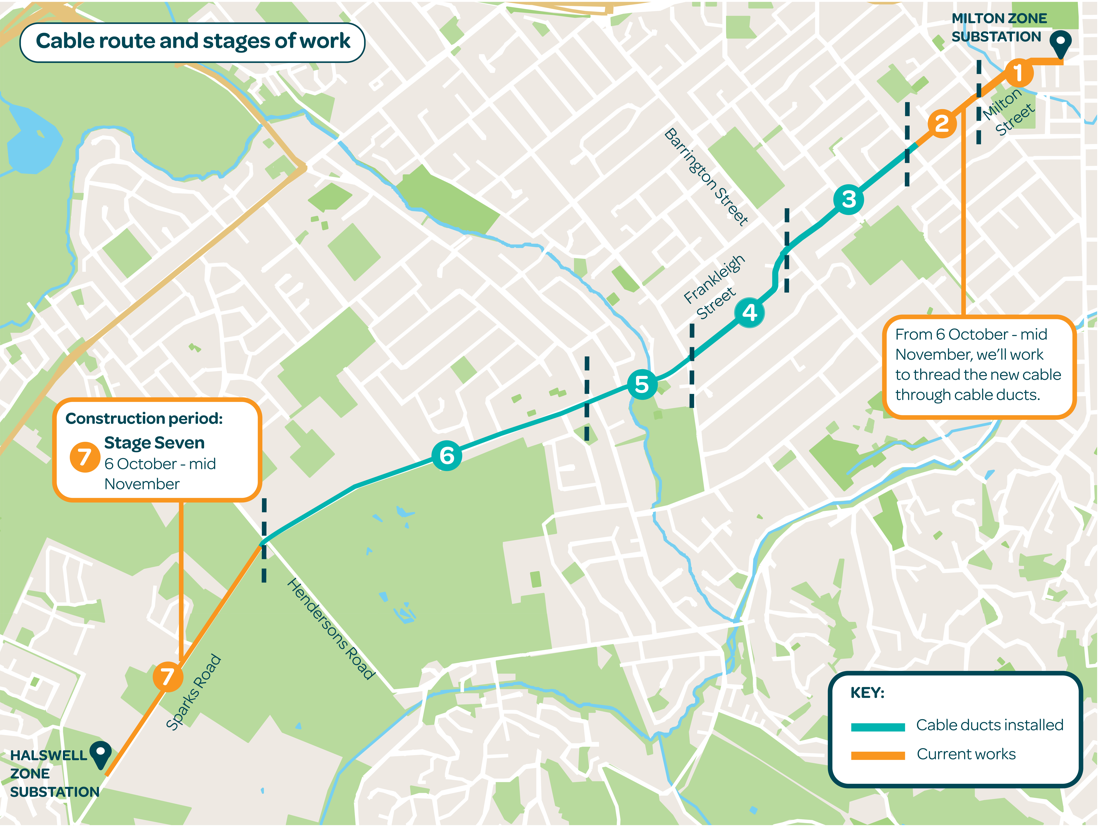 We've completed work to install cable ducts along Milton Street and Frankleigh Street. We’re expecting to finish installing the remaining cable ducts by the end of this year along the 5.6km cable route. We’ll be working in stages - see map below. We’ll let communities know when we’re going to be working in their areas.