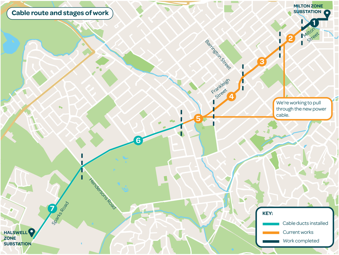 We've completed work to install cable ducts along the 5.6km cable route on Milton Street, Frankleigh Street and Sparks Road. We’ll let communities know when we’re going to be working in their areas to pull the new power cable through the ducts we've installed.